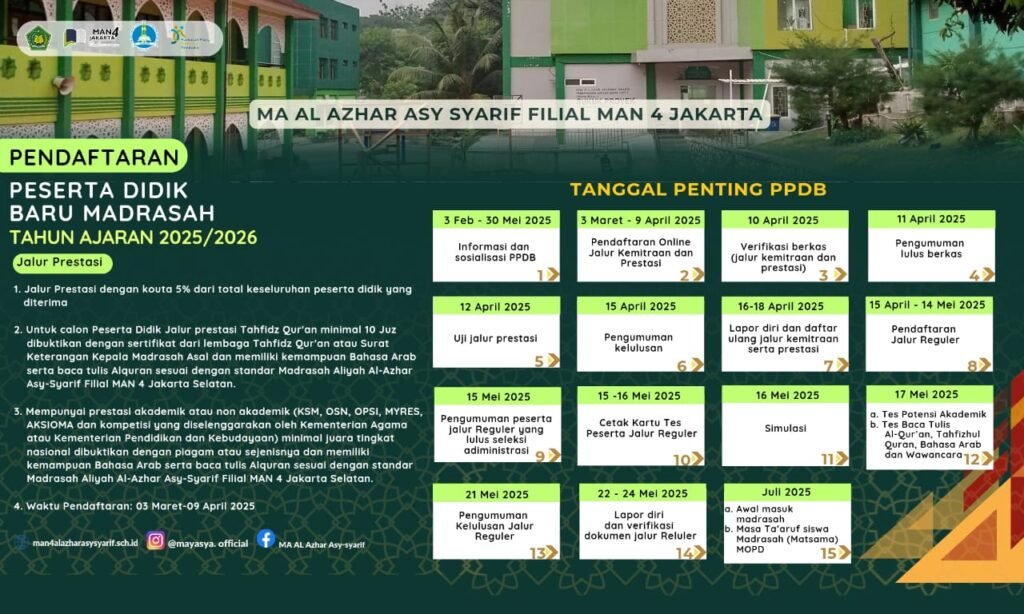 Halaman ini adalah pusat informasi PPDB MA Al-Azhar As-Syarif Indonesia Periode 2025 / 2026.